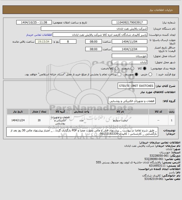 | 1 | -- | لیمیت سوئیچ | عدد | قطعات و تجهیزات الکتریکی و روشنایی | 20 | 1404/11/24 |