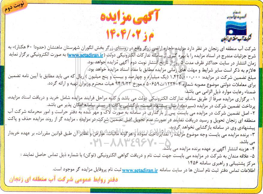 شرکت آب منطقه ای زنجان در نظر دارد مزایده «اجاره اراضی زرگر واقع در روستای زرگر بخش انگوران شهرستان ماهنشان (حدودا 60 هکتار) به شرح جزئیات مندرج در اسناد مزایده را با بهره گیری از سامانه تدارکات الکترونیکی دولت سایت ستاد ایران به صورت الکترونیکی برگزار نماید.