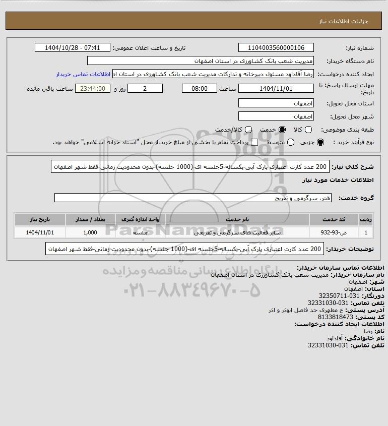 شرح کلی نیاز: 200 عدد کارت اعتباری پارک آبی-یکساله-5جلسه ای-(1000 جلسه)-بدون محدودیت زمانی-فقط شهر اصفهان