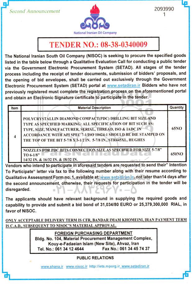 The National Iranian South Oil Company (NISOC) is seeking to procure the specified goods listed in the table below through a Qualitative Evaluation Call for conducting a public tender via the Government Electronic Procurement System (SETAD). All stages of the tender