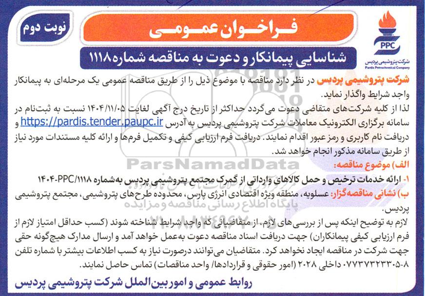 1- ارائه خدمات ترخیص و حمل کالاهای وارداتی از گمرک مجتمع پتروشیمی پردیس به شماره PPC-1404/1118