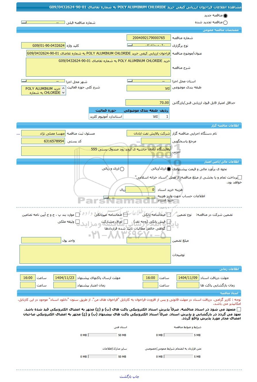 مناقصه فراخوان ارزیابی کیفی خرید POLY ALUMINUM CHLORIDE به شماره تقاضای 01-90-0432624/G09 از کلیه افراد متخصص و شرکتها واجد شرایط دعوت به عمل میآید در مناقصه با کد خبرگزاری پارس نماد: 10147766 شرکت نمایند.