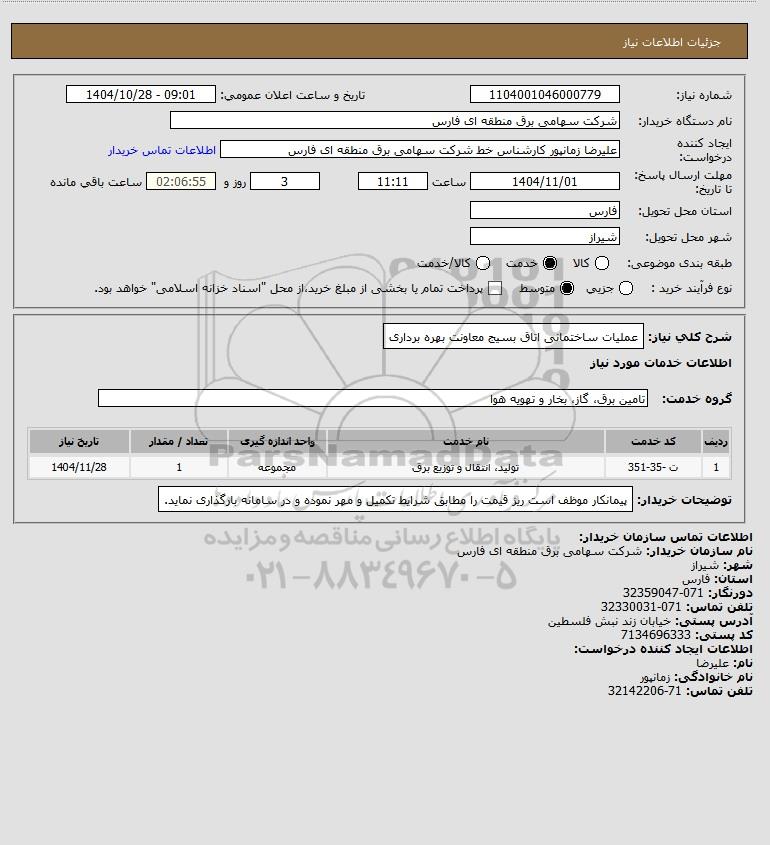 شرح کلی نیاز: عملیات ساختمانی اتاق بسیج معاونت بهره برداری
