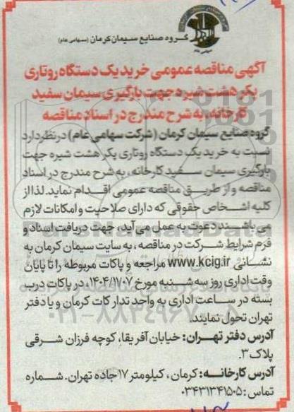 گروه صنایع سیمان کرمان (شرکت سهامی عام) در نظر دارد نسبت بهخرید یک دستگاه روتاری پکر هشت شیره جهت بارگیری سیمان سفید کارخانه، به شرح مندرج در اسناد مناقصه   و از طریق مناقصه‌ عمومی اقدام نماید.