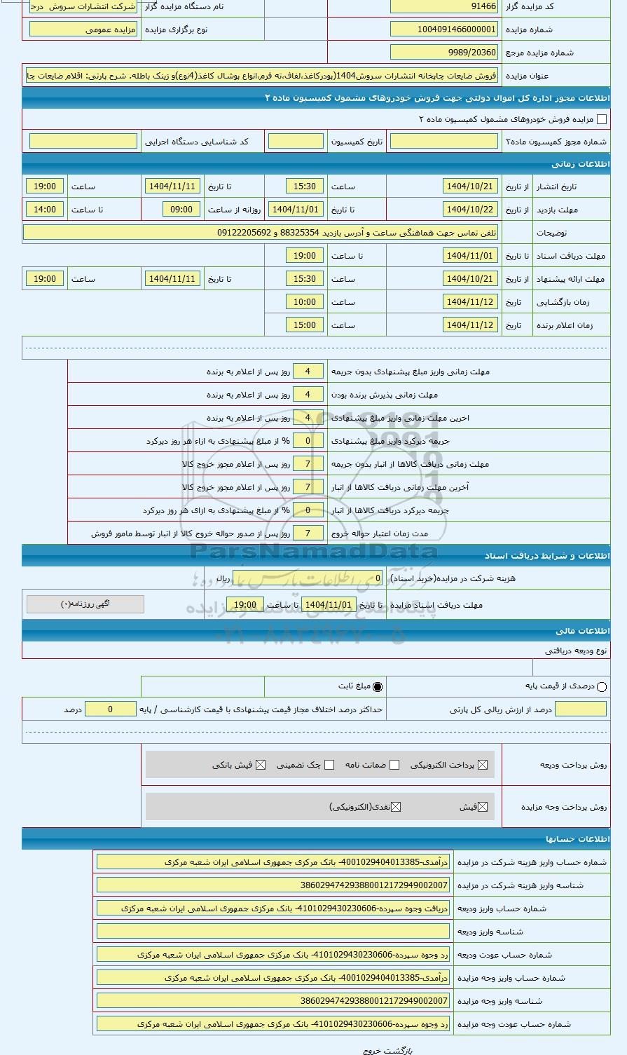 مزایده عمومی مزایده اقلام ضایعات چاپخانه شامل پودر کاغذ لفاف ته فرم انواع پوشال کاغذ(4نوع) و زینک باطله برگزار میگردد. از کلیه افراد متخصص و شرکت‌های واجد شرایط دعوت به عمل می‌آید تا در این مزایده با کد خبرگزاری پارس نماد : 10148090 شرکت نمایند تاریخ شروع مزایده : 1404/10/21 مهلت شرکت در مزایده: تا پایان روز 1404/11/01 مکان برگزاری اموال واگذاری استان‌های مزایدات استان تهران و دسته‌بندی‌های مربوط به این حراجی کاغذ, متفرقه میباشد.