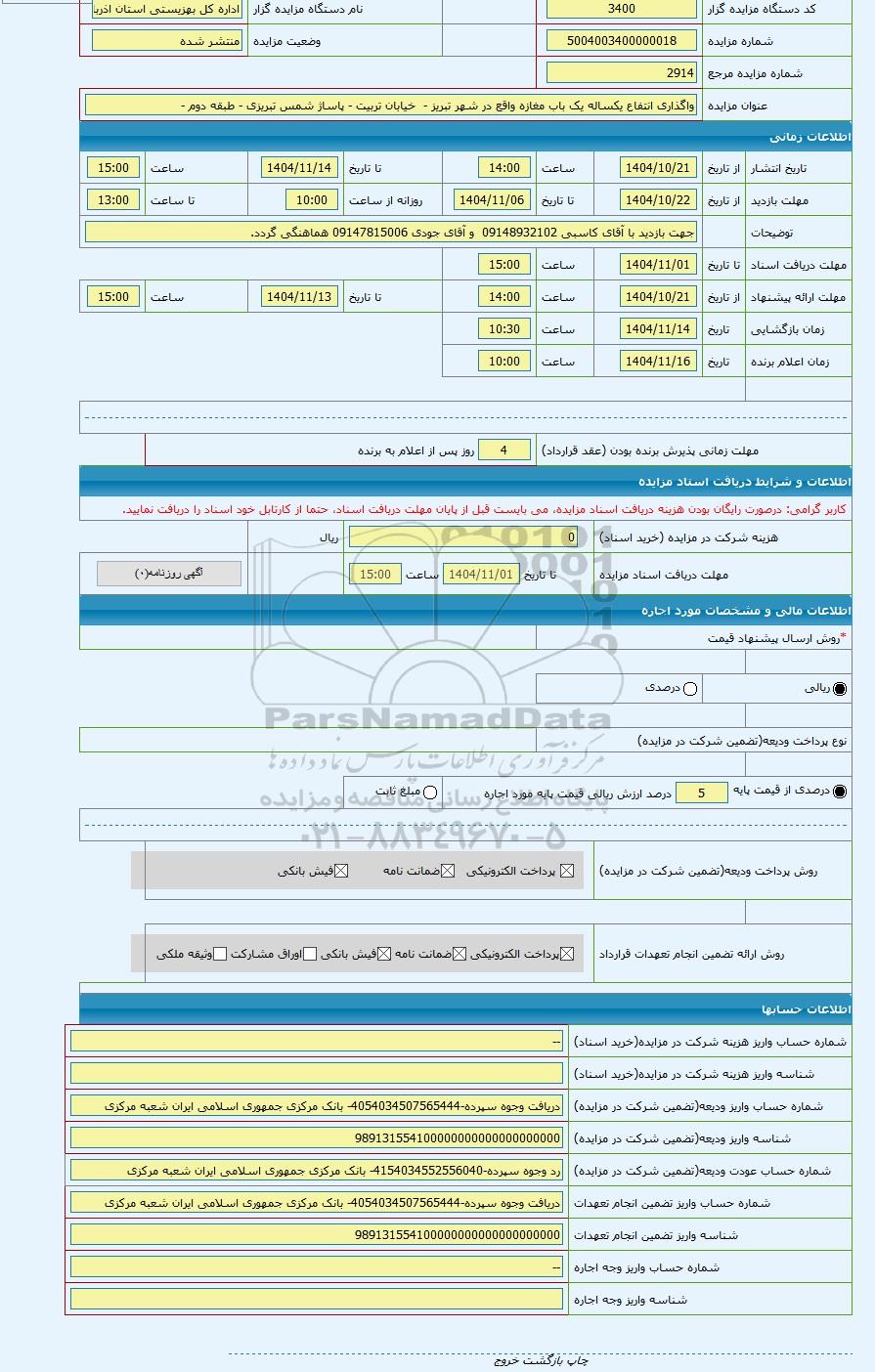| شماره مورد اجاره | 5104003400000018 | نوع برگزاری مزایده | مزایده عمومی | |