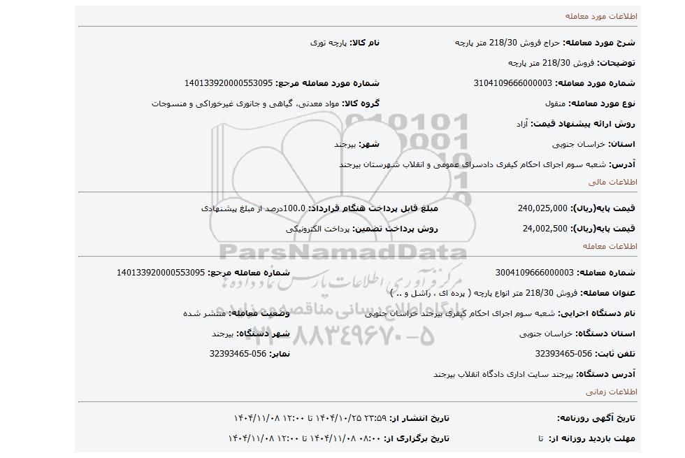 | شماره مورد معامله: 3104109666000003 | شماره مورد معامله مرجع: 140133920000553095 | |