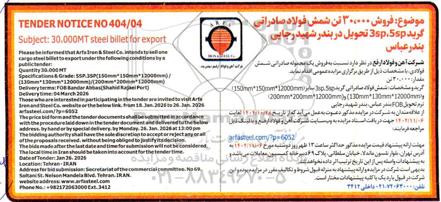 شرکت آهن و فولاد ارفع در نظر دارد نسبت به فروش یک محموله صادراتی شمش فولادی با مشخصات ذیل از طریق برگزاری مزایده عمومی اقدام نماید.
