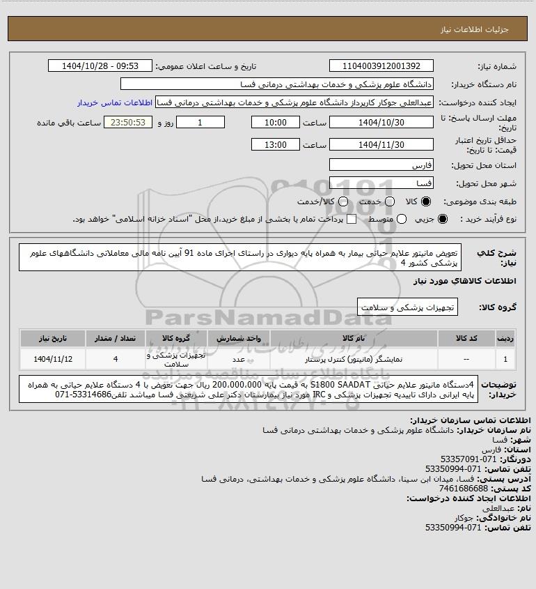 شرح کلی نیاز: تعویض مانیتور علایم حیاتی بیمار به همراه پایه دیواری در راستای اجرای ماده 91 آیین نامه مالی معاملاتی دانشگاههای علوم پزشکی کشور 4