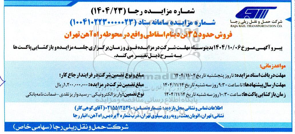 شرکت حمل و نقل ریلی رجا (سهامی خاص) در نظر دارد مزایده فروش حدود 35 تن دینام اسقاطی واقع در محوطه راه آهن تهران به شماره 1004102230000023 را از طریق سامانه تدارکات الکترونیکی دولت برگزار کند. کلیه مراحل برگزاری مزایده از دریافت و تحویل اسناد مزایده تا بازگشایی پاکتها از طریق درگاه سامانه تدارکات الکترونیکی دولت (ستاد) ایران انجام خواهد شد. متقاضیان شرکت در مزایده در صورت عدم عضویت در سامانه، نسبت به ثبت نام و دریافت گواهی امضای الکترونیکی (به صورت برخط) برای کلیه صاحبان امضای مجاز و مهر سازمانی اقدام لازم را به عمل آورند.