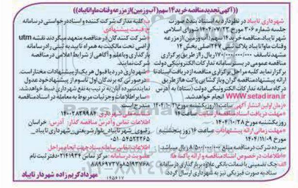 شهرداری تایباد در نظر دارد به استناد بند 5 صورتجلسه شماره 306 مورخ 1404.07.23 شورای اسلامی شهر تایباد مناقصه خرید 14 سهم (آب و زمین) از مزرعه و قنات ماوا تایباد پلاک ثبتی 247 اصلی بخش 14 مشهد تا سقف 170.000.000.000 ریال را از طریق برگزاری مناقصه عمومی در بستر سامانه تدارکات الکترونیکی دولت برگزار نماید کلیه مراحل برگزاری مناقصه از دریافت استاد تا ارائه پیشنهاد مناقصه گران و بازگشایی پاکتها از طریق درگاه سامانه تدارکات الکترونیکی دولت (ستاد) به آدرس ستاد ایران خواهد شد.