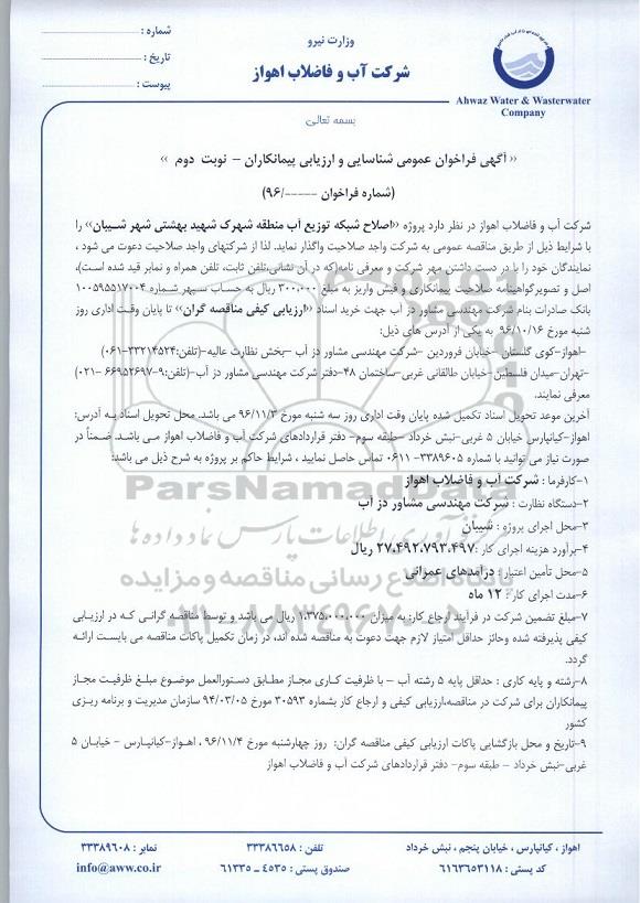 شرکت آب و فاضلاب اهواز در نظر دارد پروژه "اصلاح شبکه توزیع آب منطقه شهرک شهید بهشتی شهر شیبان " را با شرایط ذیل از طریق مناقصه عمومی به شرکت واجد صلاحیت واگذار نماید . لذا از شرکتهای واجد صلاحیت دعوت می شود . نمایندگان خود را با در دست داشتن مهر شرکت و معرفی ناممه ( که در آن نشانی ، تلفن ثابت ، تلفن همراه و نمابر قید شده است ) . اصل و تصویر گواهینامه صلاحیت پیمانکاری و فیض واریز به مبلغ 300.000 ریال به حساب سپهر شماره 100595517004 بانک صادرات بنامه شرکت مهندسی مشاور در آب جهت خرید اسناد " ارزیابی کیفی مناقصه گران " تا پایان وقت اداری روز شنبه مورخ 96.10.16 به یکی از آدرس های ذیل :