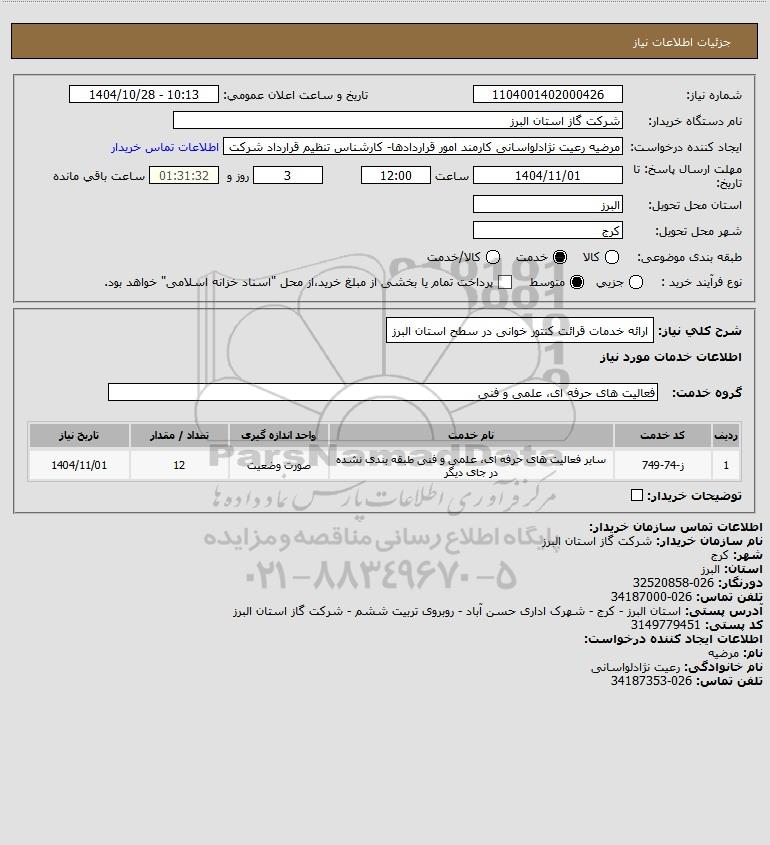 شرح کلی نیاز: ارائه خدمات قرائت کنتور خوانی در سطح استان البرز