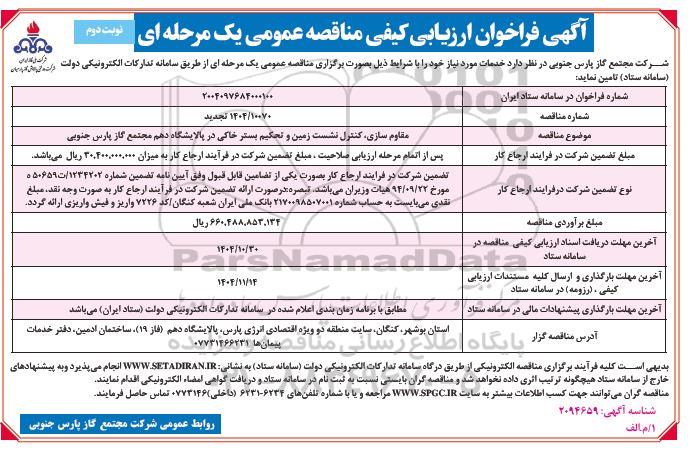 موضوع مناقصه : مقاوم سازی، کنترل نشست زمین و تحکیم بستر خاکی در پالایشگاه دهم مجتمع گاز پارس جنوبی (تجدید)