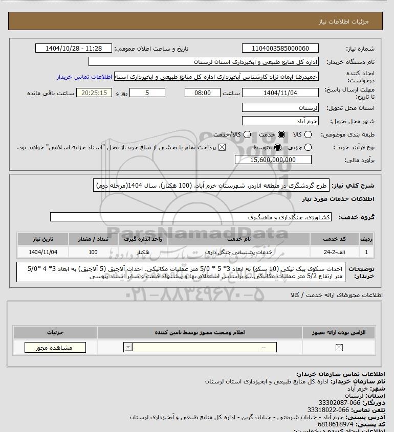 شرح کلی نیاز: طرح گردشگری در منطقه اناردر، شهرستان خرم آباد، (100 هکتار)، سال 1404(مرحله دوم)