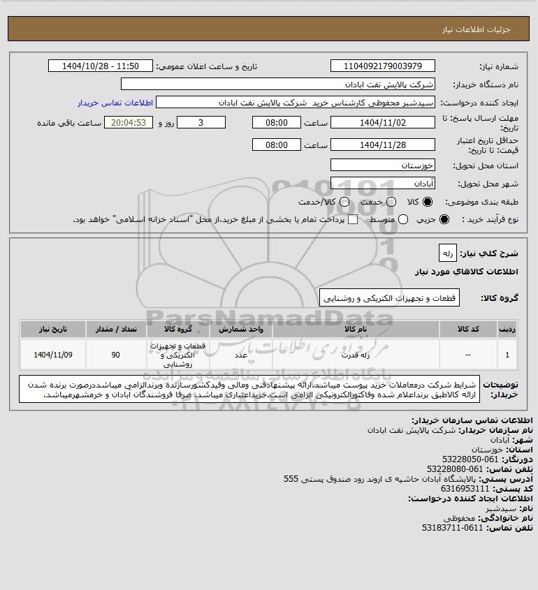 | 1 | -- | رله قدرت | عدد | قطعات و تجهیزات الکتریکی و روشنایی | 90 | 1404/11/09 |