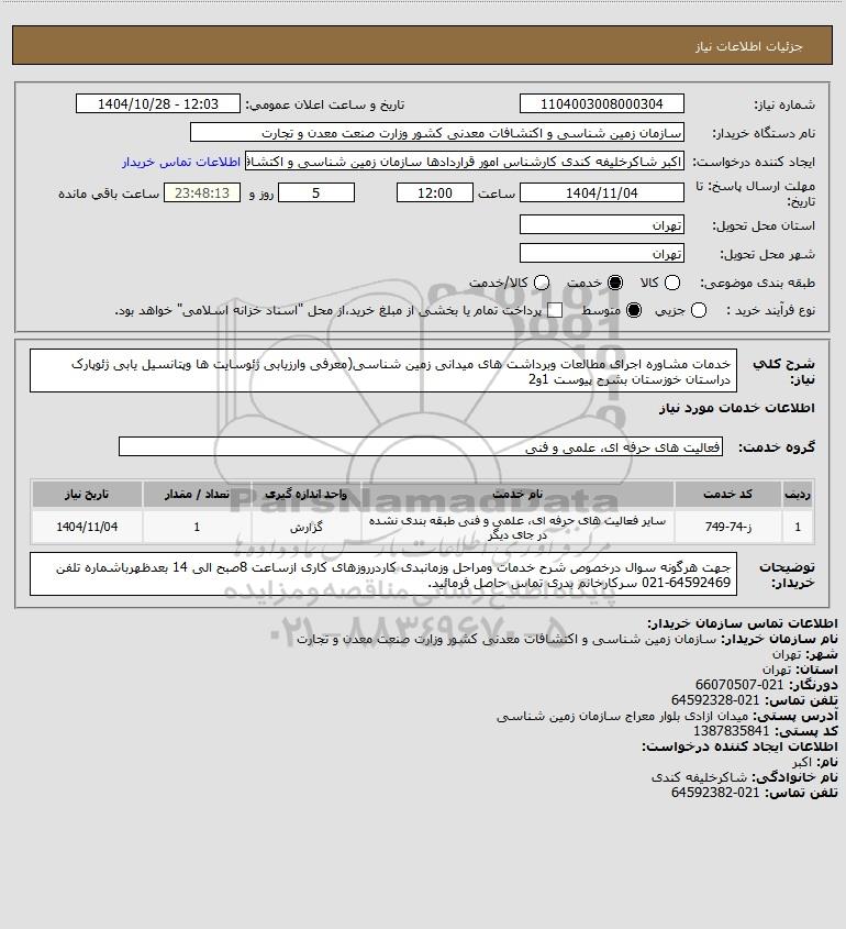 شرح کلی نیاز: خدمات مشاوره اجرای مطالعات وبرداشت های میدانی زمین شناسی(معرفی وارزیابی ژئوسایت ها وپتانسیل یابی ژئوپارک دراستان خوزستان بشرح پیوست 1و2