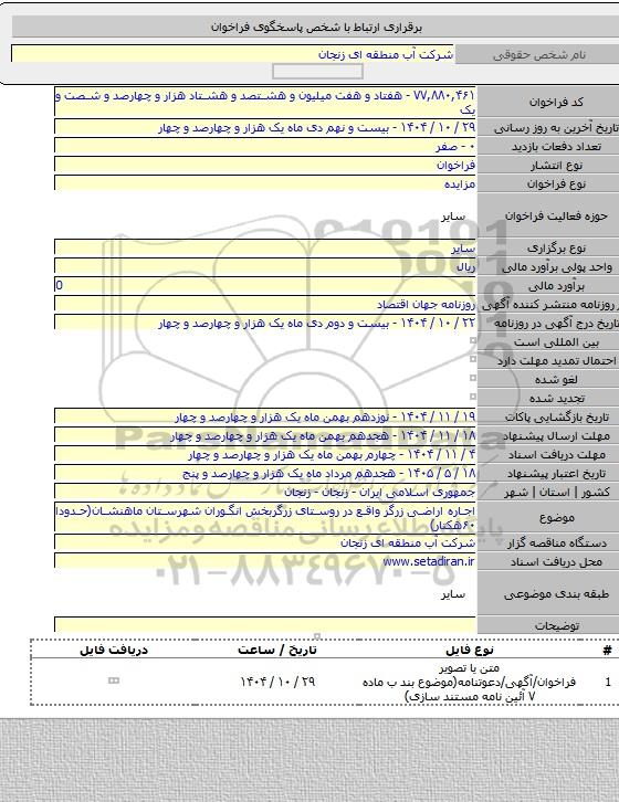 مزایده عمومی مزایده اجاره اراضی زرگر واقع در روستای زرگربخش انگوران شهرستان ماهنشان(حدودا ۶۰هکتار) برگزار میگردد. از کلیه افراد متخصص و شرکت‌های واجد شرایط دعوت به عمل می‌آید تا در این مزایده با کد خبرگزاری پارس نماد : 10151217 شرکت نمایند تاریخ شروع مزایده : 1404/10/29 مهلت شرکت در مزایده: تا پایان روز 1404/11/04 مکان برگزاری اموال واگذاری استان‌های مزایدات استان زنجان و دسته‌بندی‌های مربوط به این حراجی ماشین آلات و تجهیزات کشاورزی و دام پروری میباشد.