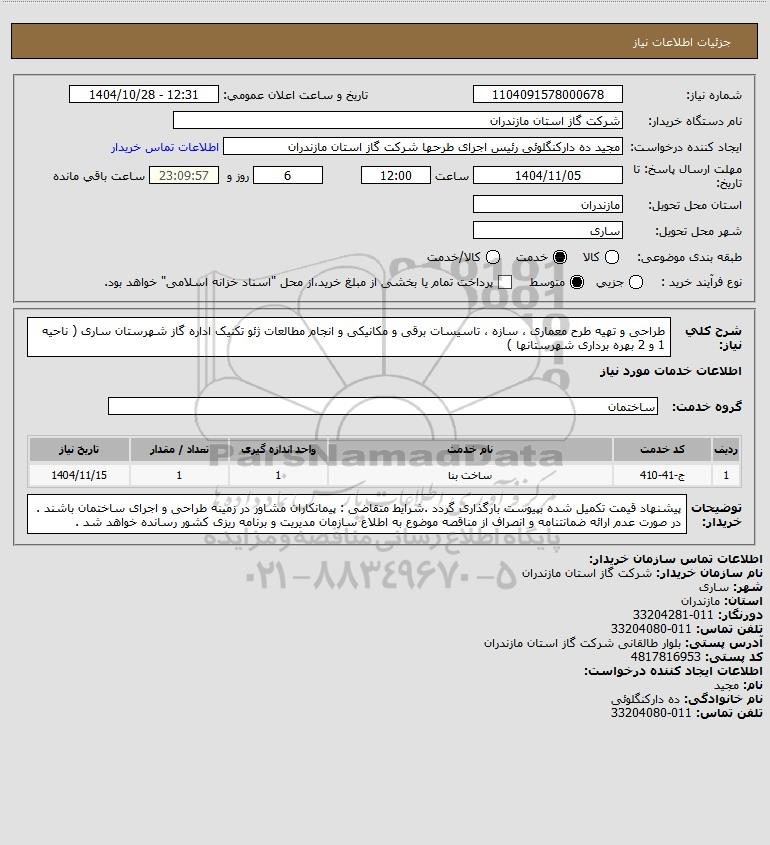 استعلام طراحی و تهیه طرح معماری سازه تاسیسات برقی و مکانیکی و انجام مطالعات ژئو تکنیک اداره گاز شهرستان ساری ( ناحیه 1 و 2 بهره برداری شهرستانها ), استعلام طراحی و تهیه طرح معماری ، سازه ، تاسیسات برقی و مکانیکی و انجام مطالعات ژئو تکنیک اداره گاز شهرستان ساری ( ناحیه 1 و 2 بهره برداری شهرستانها )