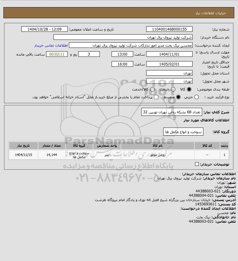 شرح کلی نیاز: تعداد 68 بشکه روغن بهران توربین 32