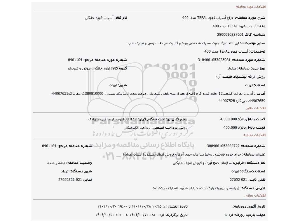 | عنوان معامله: حراج خرده فروشی برخط سازمان جمع آوری و فروش اموال تملیکی (استان تهران) | ||