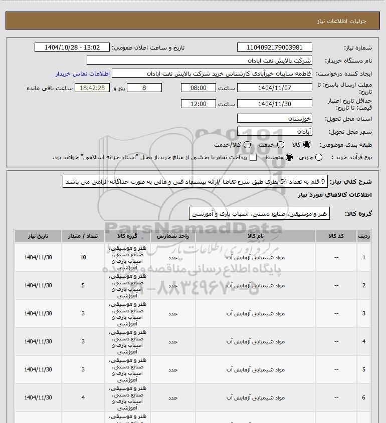 | 8 | -- | مواد شیمیایی آزمایش آب | عدد | هنر و موسیقی، صنایع دستی، اسباب بازی و آموزشی | 15 | 1404/11/30 |