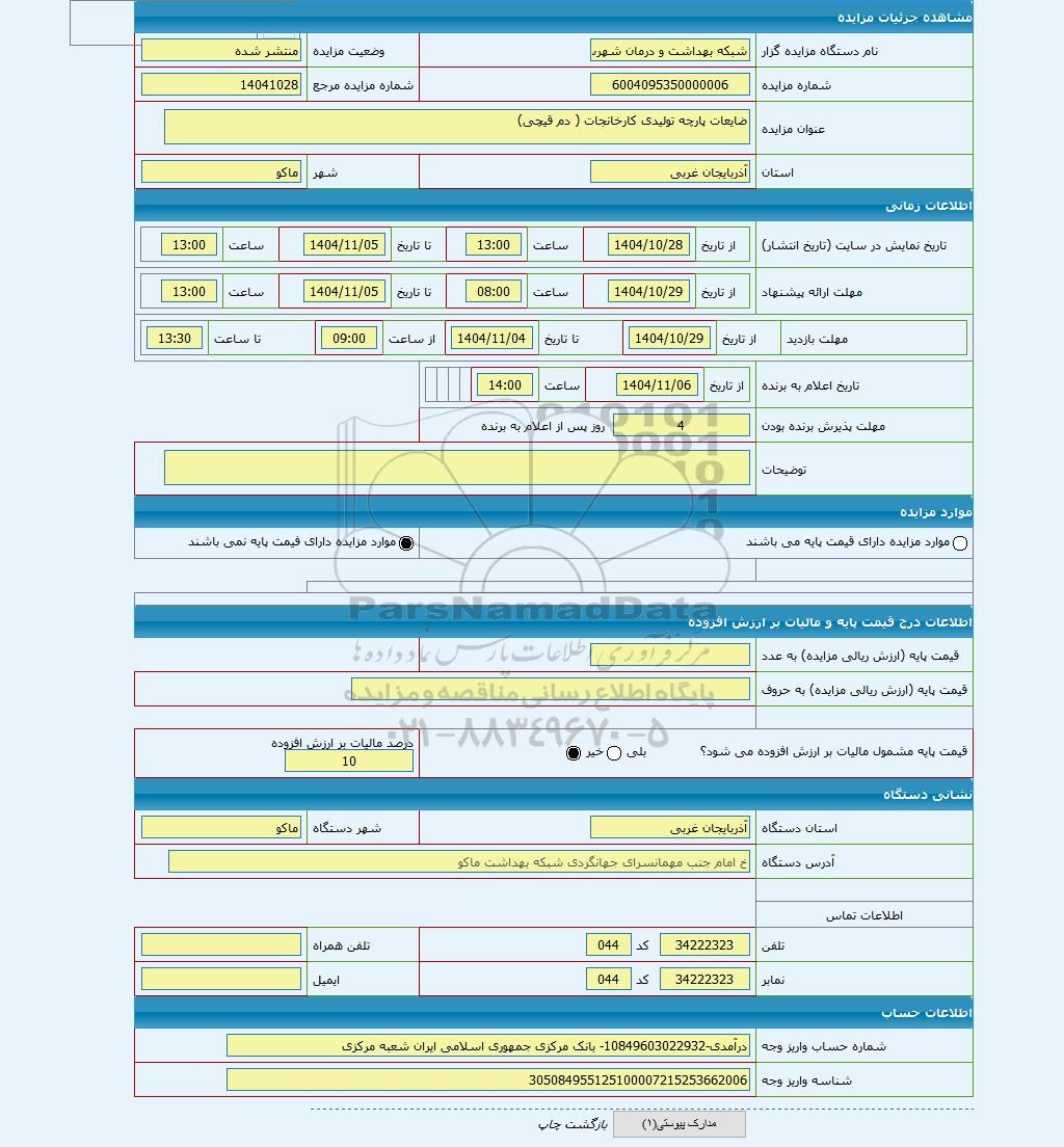 | نام دستگاه مزایده گزار | شبکه بهداشت و درمان شهرستان ماکو | وضعیت مزایده | منتشر شده | |