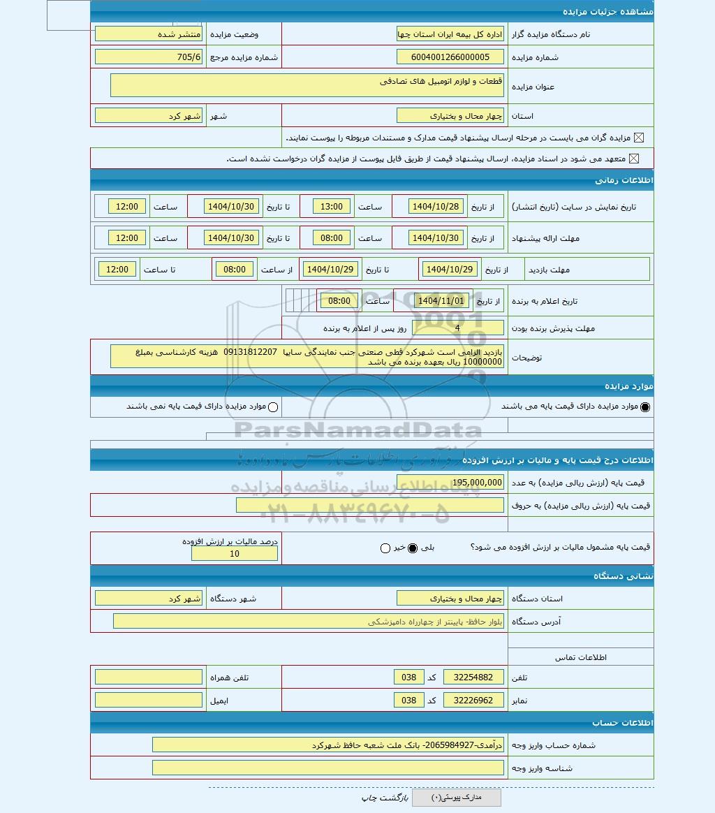 | نام دستگاه مزایده گزار | اداره کل بیمه ایران استان چهارمحال بختیاری | وضعیت مزایده | منتشر شده | |