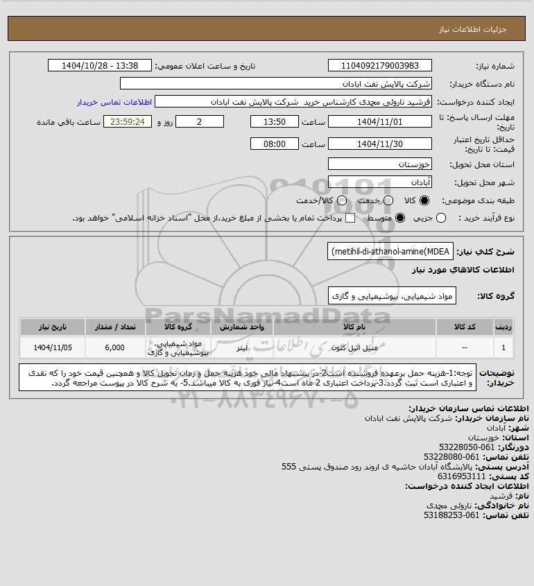 شرح کلی نیاز: metihil-di-athanol-amine(MDEA)