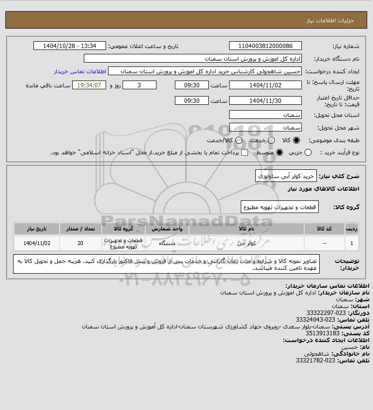| 1 | -- | کولر آبی | دستگاه | قطعات و تجهیزات تهویه مطبوع | 20 | 1404/11/02 |