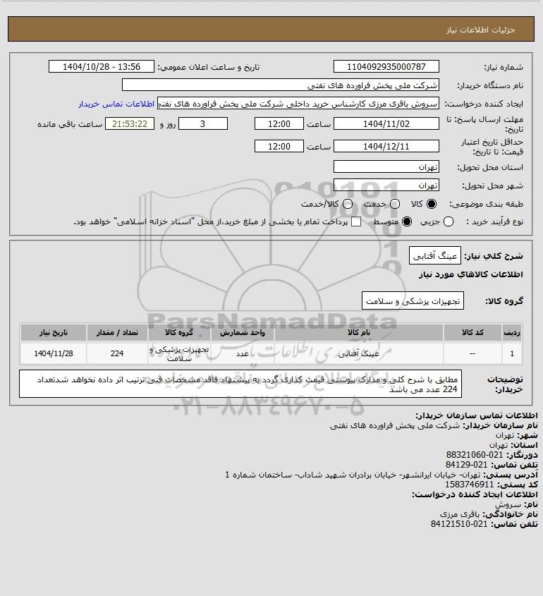 | 1 | -- | عینک آفتابی | عدد | تجهیزات پزشکی و سلامت | 224 | 1404/11/28 |
