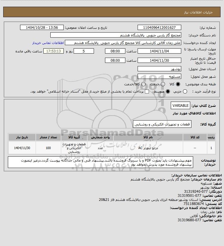 | 1 | -- | درایو اینورتر AC | عدد | قطعات و تجهیزات الکتریکی و روشنایی | 100 | 1404/11/30 |