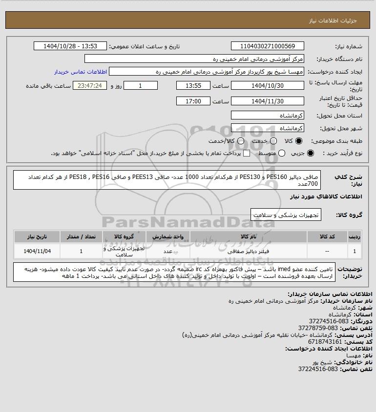 شرح کلی نیاز: صافی دیالیز PES160 و PES130 از هرکدام تعداد 1000 عدد- صافی PEES13 و صافی PES18 , PES16 از هر کدام تعداد 700عدد
