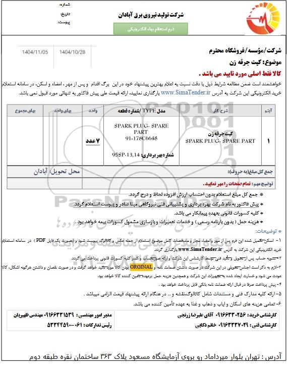 استعلام بها و موضوع استعلام استعلام تامین کیت جرقه زن به اطلاع کلیه شرکتها و افراد متخصص واجد شرایط میرساند، آگهی گذار در نظر دارد از طریق استعلام بها، نسبت به انتخاب و دریافت پیشنهادات اقدام نماید. این استعلام با کد آگهی ثبت شده در سامانه خبرگزاری پارس نماد : 10152259 منتشر شده است. مشخصات استعلام : تاریخ شروع استعلام: 1404/10/28 آخرین مهلت ارسال پیشنهاد قیمت : 1404/11/05 و محل اجرای پروژه : استان مناقصات استان خوزستان میباشد. استعلام قیمت مورد درخواست : استعلام تامین کیت جرقه زن با دستهبندیهای تخصصی و گروه های مرتبط : نیروگاه, تجهیزات برق و الکترونیک, استعلام اطلاع رسانی میگردد.