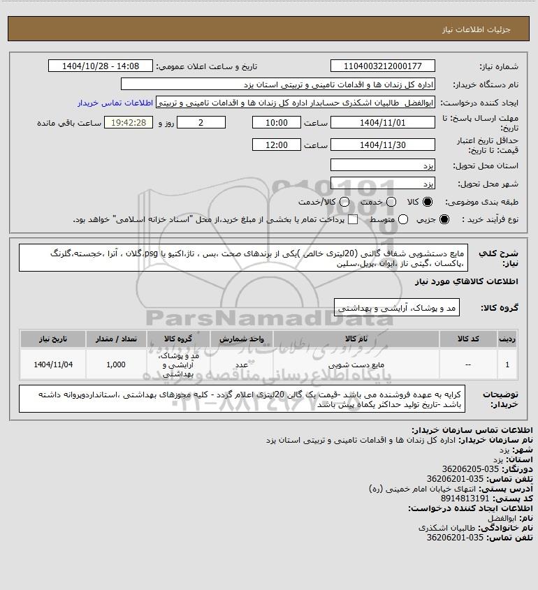 | 1 | -- | مایع دست شویی | عدد | مد و پوشاک، آرایشی و بهداشتی | 1,000 | 1404/11/04 |