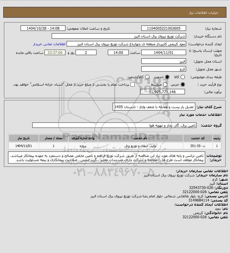 استعلام بها و موضوع استعلام استعلام تعدیل بار پست و مقابله با ضعف ولتاژ - تابستان 1405 به اطلاع کلیه شرکتها و افراد متخصص واجد شرایط میرساند، آگهی گذار در نظر دارد از طریق استعلام بها، نسبت به انتخاب و دریافت پیشنهادات اقدام نماید. این استعلام با کد آگهی ثبت شده در سامانه خبرگزاری پارس نماد : 10152290 منتشر شده است. مشخصات استعلام : تاریخ شروع استعلام: 1404/10/28 آخرین مهلت ارسال پیشنهاد قیمت : 1404/11/01 و محل اجرای پروژه : استان مناقصات استان البرز میباشد. استعلام قیمت مورد درخواست : استعلام تعدیل بار پست و مقابله با ضعف ولتاژ - تابستان 1405 با دستهبندیهای تخصصی و گروه های مرتبط : پیمانکاری برق و الکترونیک, پست و انتقال نیرو, استعلام اطلاع رسانی میگردد.