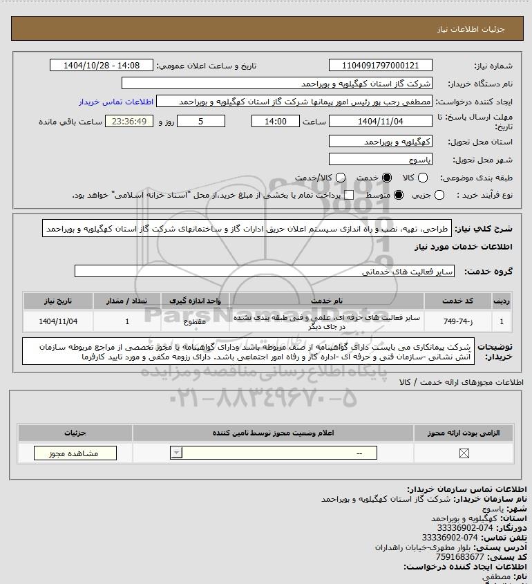 شرح کلی نیاز: طراحی، تهیه، نصب و راه اندازی سیستم اعلان حریق ادارات گاز و ساختمانهای شرکت گاز استان کهگیلویه و بویراحمد