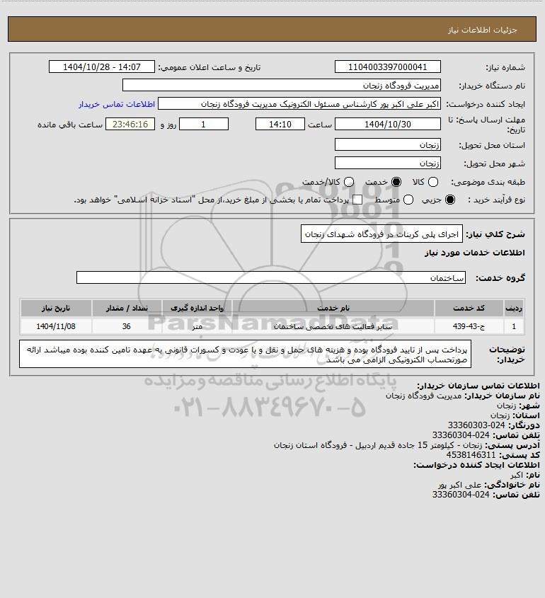 شرح کلی نیاز: اجرای پلی کربنات در فرودگاه شهدای زنجان