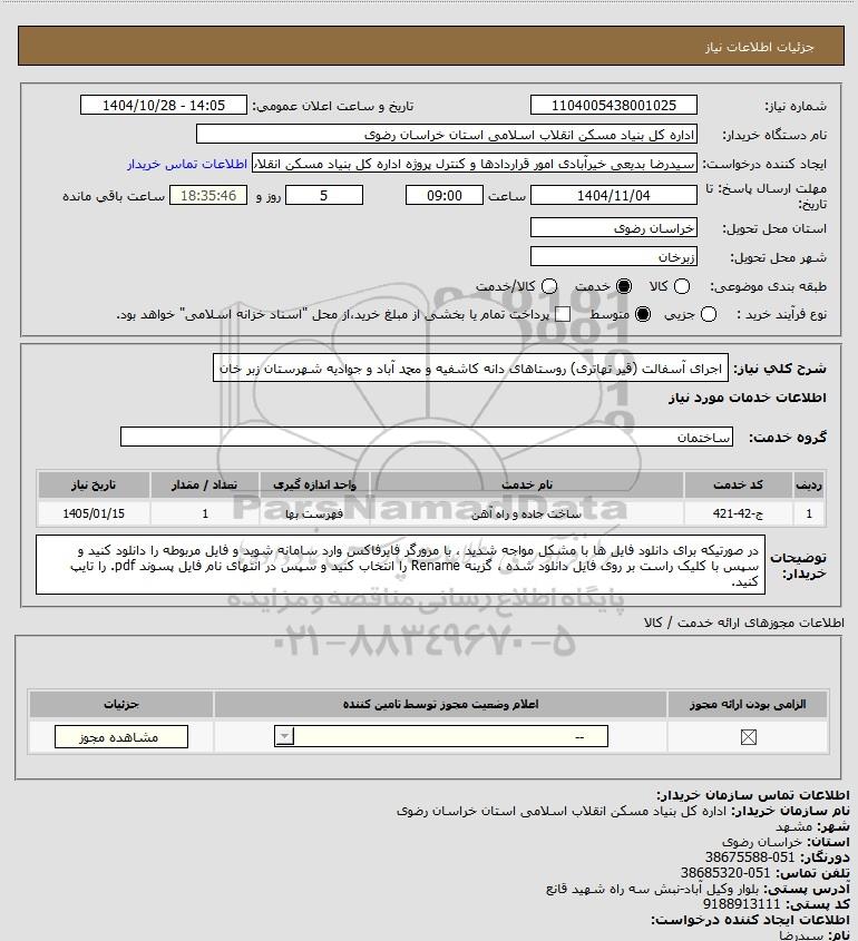 شرح کلی نیاز: اجرای آسفالت (قیر تهاتری) روستاهای دانه کاشفیه و محمد آباد و جوادیه شهرستان زبر خان