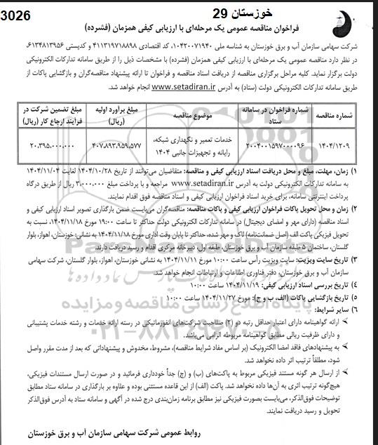 شرکت سهامی سازمان آب و برق خوزستان به شناسه ملی 10420071940، کد اقتصادی 411319718898 و کدپستی 6134813956 در نظر دارد مناقصه عمومی همزمان با ارزیابی کیفی (فشرده) یک مرحله ای با مشخصات ذیل را از طریق سامانه تدارکات الکترونیکی دولت برگزار نماید. کلیه مراحل برگزاری مناقصه از دریافت اسناد مناقصه و فراخوان تا ارائه پیشنهاد مناقصه گران و بازگشایی پاکات از طریق سامانه تدارکات الکترونیکی دولت (ستاد) به آدرس ستاد ایران انجام خواهد شد.