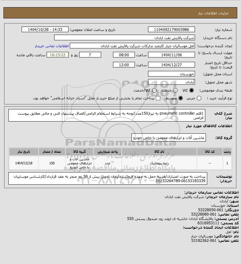 شرح کلی نیاز: 1قلم pneumatic controller به تیراژ150عدد/توجه به شرایط استعلام الزامی/الصاق پیشنهاد فنی و مالی مطابق پیوست الزامی