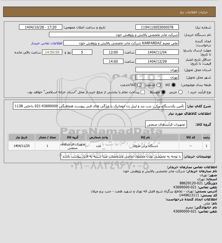 شرح کلی نیاز: تأمین یکدستگاه پرکن، درب بند و لیبل زن اتوماتیک با ویژگی های فنی پیوست هماهنگی 43690000-021 داخلی 1138