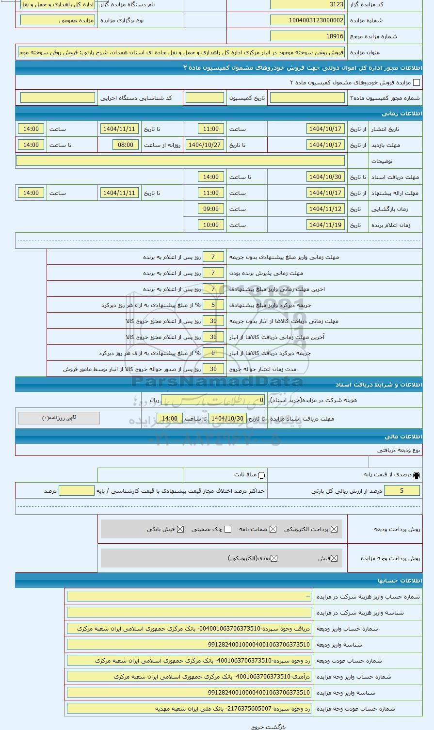 | شماره حساب واریز وجه مزایده | درآمدی-4001063706373510- بانک مرکزی جمهوری اسلامی ایران شعبه مرکزی |