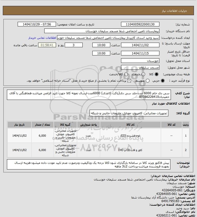 | 1 | -- | لوح فشرده (CD) | عدد | تجهیزات مخابراتی، کامپیوتر، موبایل، ملزومات جانبی و شبکه | 6,000 | 1404/11/02 |