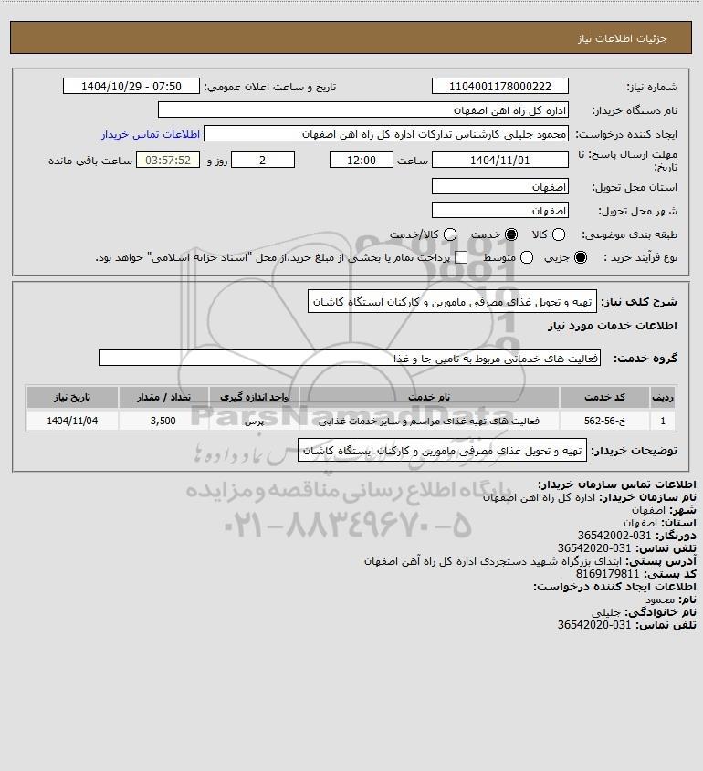 استعلام تهیه و تحویل غذای مصرفی مامورین و کارکنان ایستگاه کاشان, استعلام تهیه و تحویل غذای مصرفی مامورین و کارکنان ایستگاه کاشان
