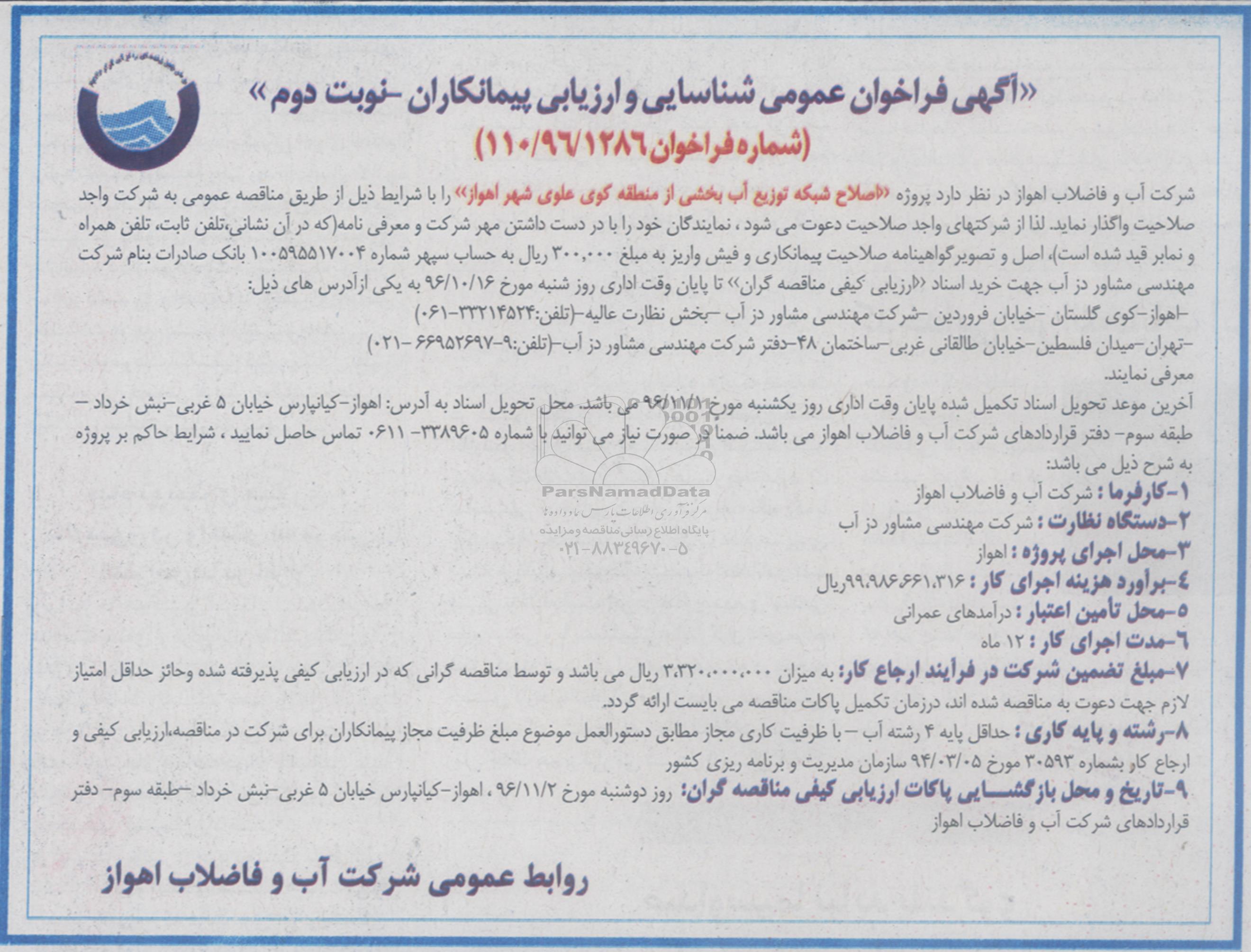 تاریخ و محل بازگشایی پاکات ارزیابی کیفی مناقصه گران روز دوشنبه مورخ 96.11.2 اهواز کیانپارس خیابان 5 غربی نبش خرداد طبقه سوم دفتر قراردادهای شرکت آب و فاضلاب اهواز