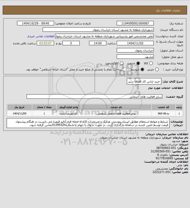شرح کلی نیاز: خرید لباس کار فضای سبز