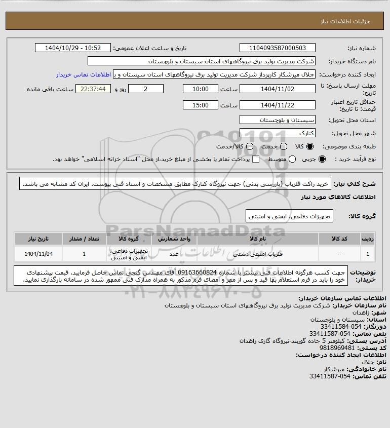 شرح کلی نیاز: خرید راکت آشکارساز فلز (بازرسی بدنی) جهت نیروگاه کنارک مطابق مشخصات و اسناد فنی پیوست. ایران کد مشابه می باشد.
