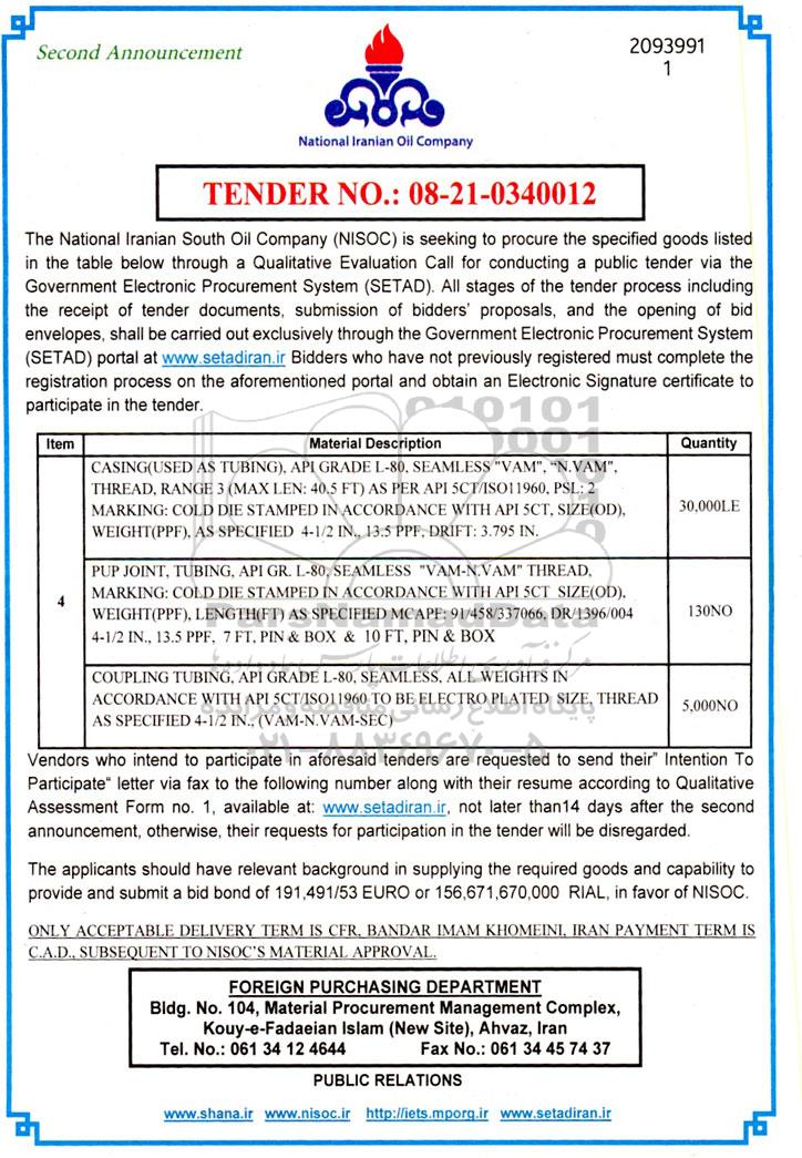 The National Iranian South Oil Company (NISOC) is seeking to procure the specified goods listed