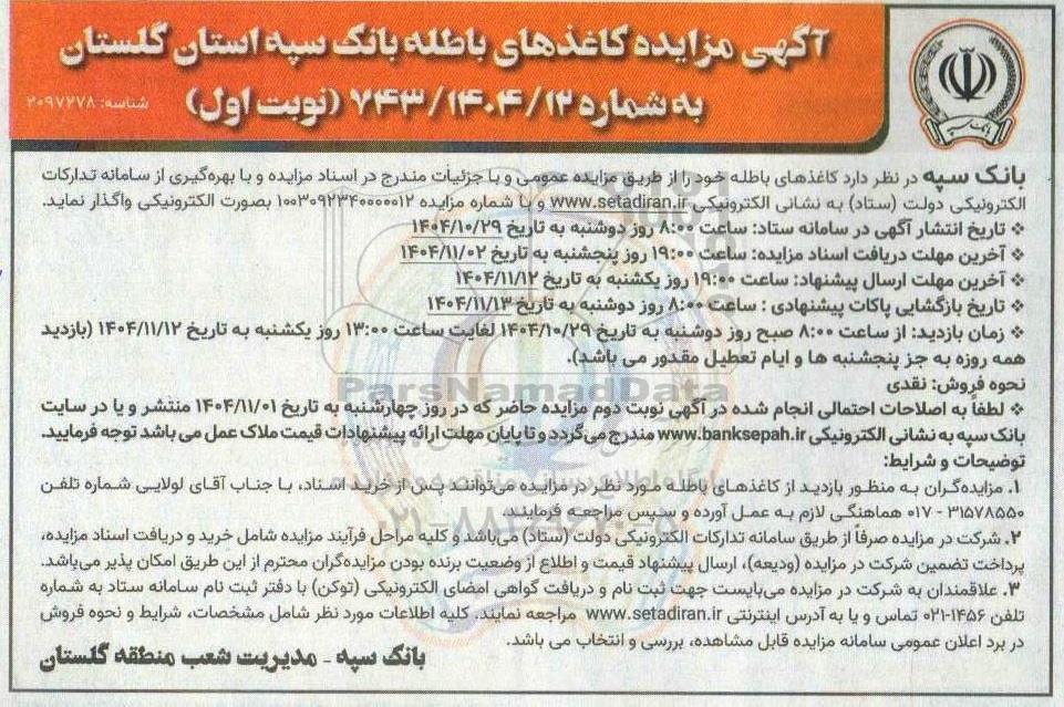 آگهی مزایده کاغذهای باطله بانک سپه استان گلستان به شماره 743/1404/12 ؟؟